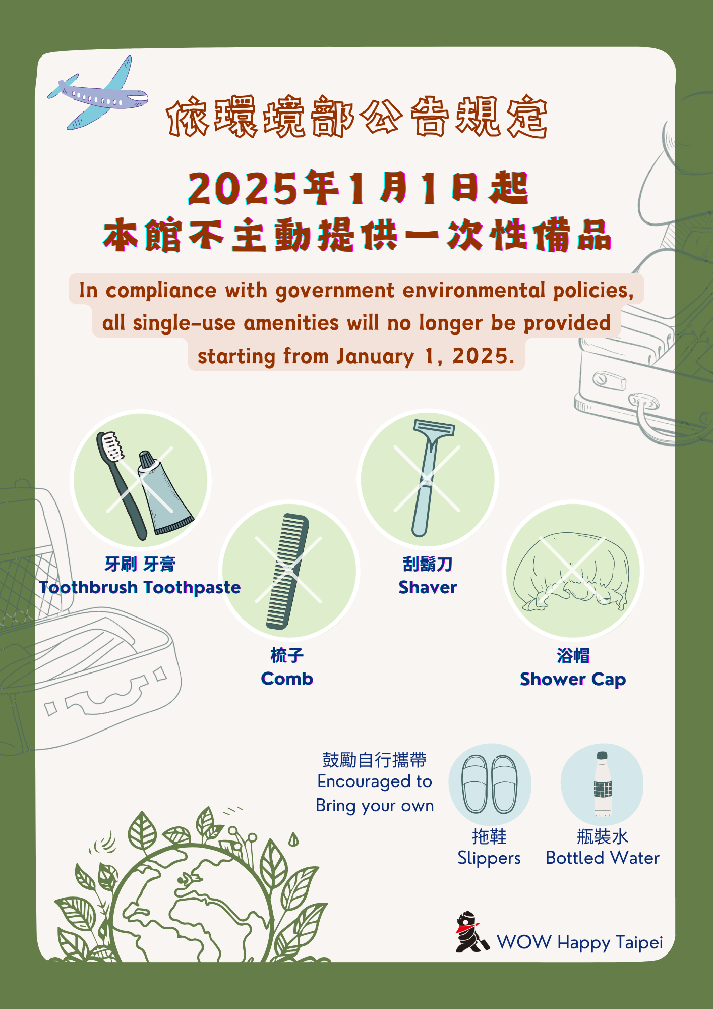 本館依環境部政策,自2025年1月1日起,將不提供部分一次性備品(梳子、牙刷、牙膏、棉花棒、刮鬍刀、牙線、浴帽、化妝棉),並鼓勵貴賓自備拖鞋及容器於1樓大廳自取飲用水。